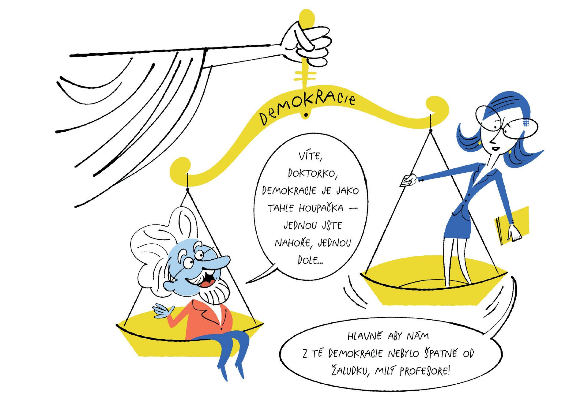v domácnosti. každá rodina má nějaká pravidla – kdy se chodí spát, kdo vynáší odpadky, jak se rozdělují domácí práce. a stejně tak má pravidla i společnost. Jenže zatímco doma vám je většinou určují rodiče, ve společnosti si je vytváříme společně. No, ne všude na světě, ale alespoň v demokracii, o které si budeme hodně povídat. politika je vlastně nekonečné domlouvání se o tom, jak by měla naše sdílená domácnost fungovat. Někdo si myslí, že by se mělo více investovat do zateplení domu (tedy do životního prostředí), jiný by raději opravil výtah (tedy dopravní infrastrukturu). Jeden chce přísnější pravidla pro noční klid, druhý by rád pořádal večírky až do rána. a protože máme každý jiné představy, potřebujeme způsob, jak se dohodnout.