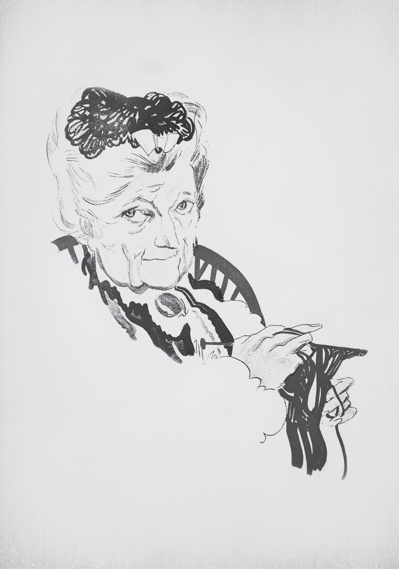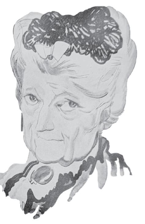 na protější straně: Úplně první portrét slečny Marplové, nakreslený Gilbertem Wilkinsonem jako ilustrace povídky Úterní klub, která v prosinci 1927 v The Royal Magazine zahájila vydání série šesti příběhů.