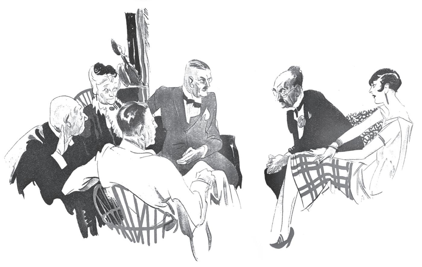 Agatha Christie jednou prohlásila: „Slečna Marplová mi vklouzla do života tak tiše, že jsem ani nepostřehla její příchod.“ A její příchod byl skutečně nenápadný, jak pro ni bylo typické.9 Prvních šest příběhů slečny Marplové vycházelo nejprve od prosince 1927 v britském měsíčníku The Royal Magazine. V první záhadě jsou čtenáři seznámeni s Úterním klubem (takto se jmenuje i povídka) a doprovází ji typicky hyperbolické tvrzení časopisu, že se jedná o „úvodní z napínavé série záhadných příběhů – nejlepších, jaké kdy tato proslulá autorka napsala“.10 V těchto volně navazujících povídkách každý ze šesti členů klubu přednese záhadu, s níž se setkal, nahoře: Členové Úterního klubu, jak je ztvárnil Gilbert Wilkinson v The Royal Magazine (1927).