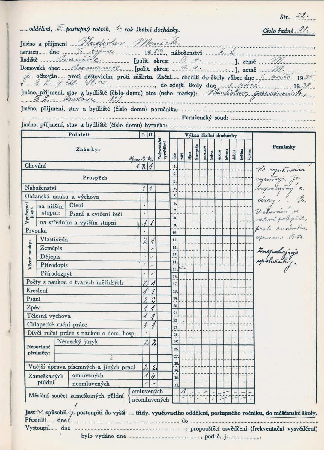 Nedlouho před stěhováním proběhla 6. srpna 1941 v Protektorátu reorganizace českých středních škol, a tím i škol měšťanských. Z nejdůležitějších změn uveďme, že se měšťanská škola přejmenovala na „hlavní“ a nyní navazovala na čtvrtý ročník školy obecné.134 Žáci tedy mezi těmito ústavy, pokud měli štěstí a vešli se do úzkého výběru, přestupovali o rok dříve než starší ročníky. Pokud toto víme, nepřekvapí nás, že Vladislav Menšík nastoupil po prázdninách na nové škole místo do druhého rovnou do třetího ročníku. Podle klasifi kačního protokolu se o žádném předmětu nedá říci, že by v něm Menšík prospíval. Opět vidíme spíše slabý průměr se známkami chvalitebnými a dobrými. Jedničky získal pouze z tělocviku a zpěvu.