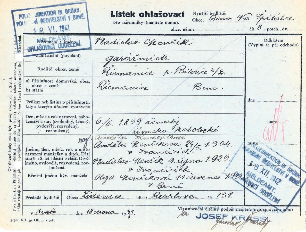 Ohlašovací lístek Vladislava Menšíka (otce) z 18. června 1941, z doby přestěhování se do nového bydliště Na Špitálce 8.