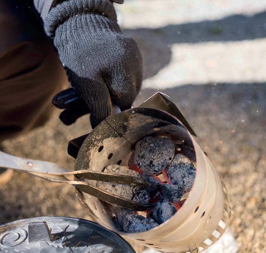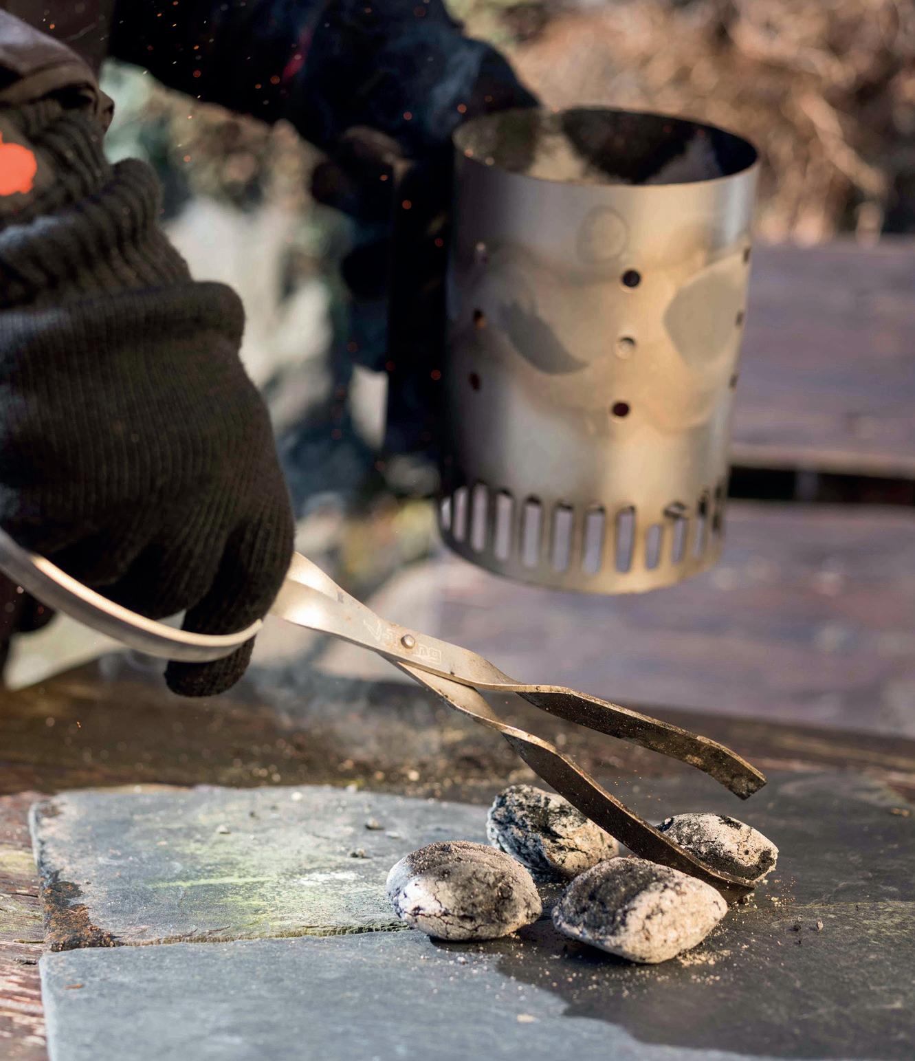 Pokud máte na výběr mezi uhlím a briketami, zvolte brikety. Vydrží žhavé podstatně déle než dřevěné uhlí a dají se snáze a rovnoměrněji rozmísťovat. Ostatně všechny údaje, které jsou tu k nalezení, jsou uvedeny na obalu briket. Kousky dřevěného uhlí se často velmi liší ve velikosti, což pochopitelně ztěžuje regulování teploty. Ideální jsou bukové nebo kokosové brikety. Ty vydrží hořet velmi dlouho, téměř 6 hodin. U receptů v této knize vždy uvádíme počet briket a jejich konkrétní umístění, ale i přibližnou docílenou teplotu. Postupně pro to získáte cit. Více se o tom dočtete na následujících stránkách.