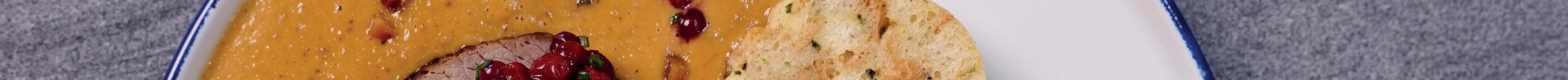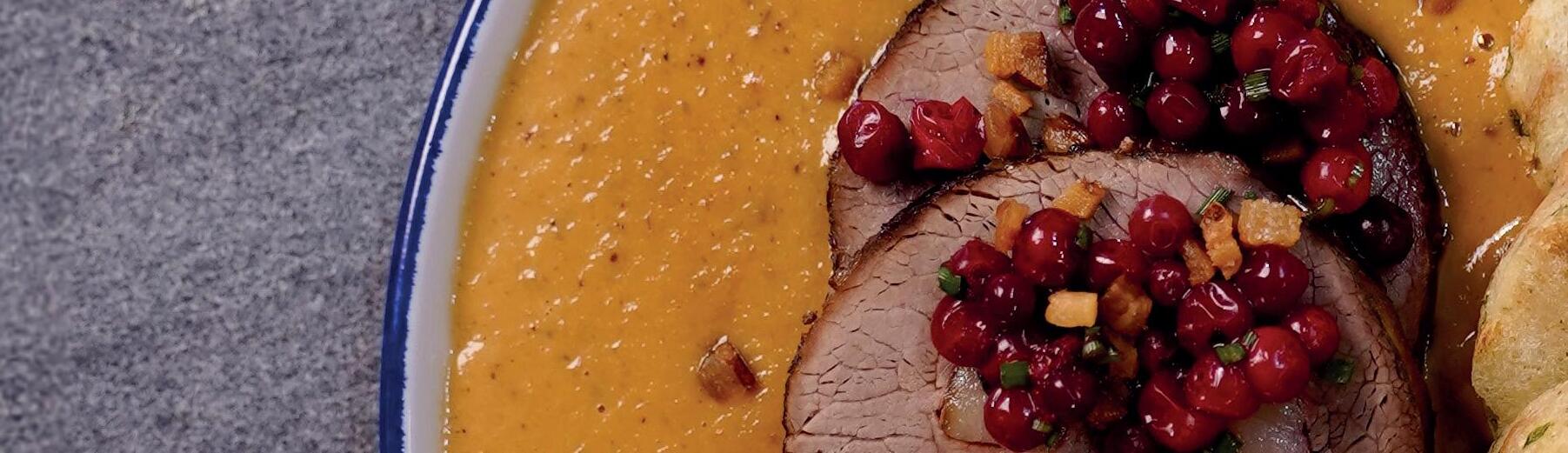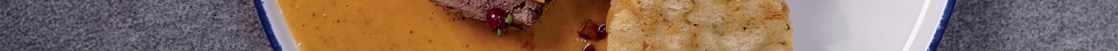 Omáčku podáváme s karlovarským knedlíkem, s plátky hovězího masa, brusinkami a sypeme škvarky z uzeného špeku.