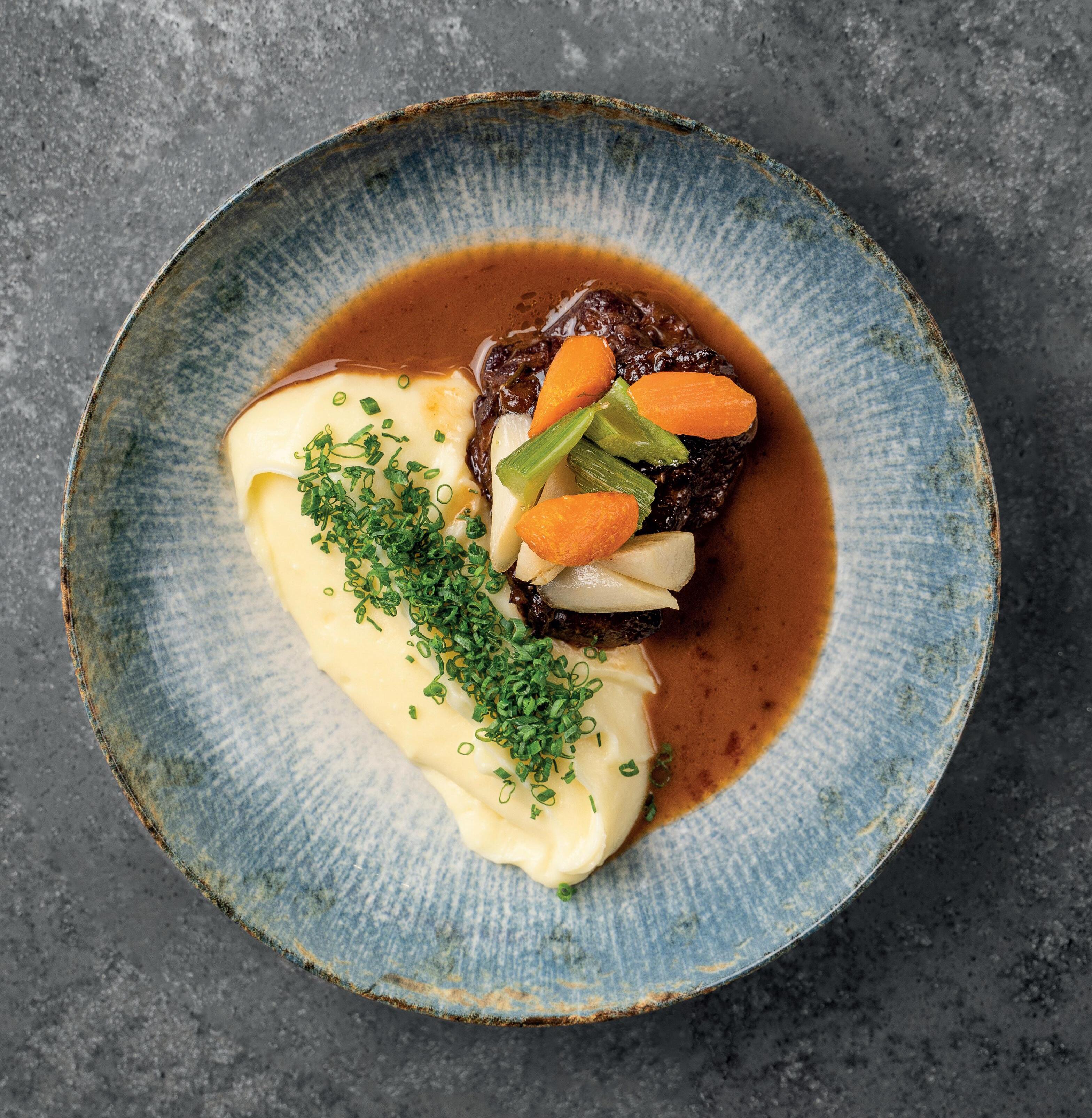 Telecí líčka na víně s kořenovou zeleninou a bramborovou kaší