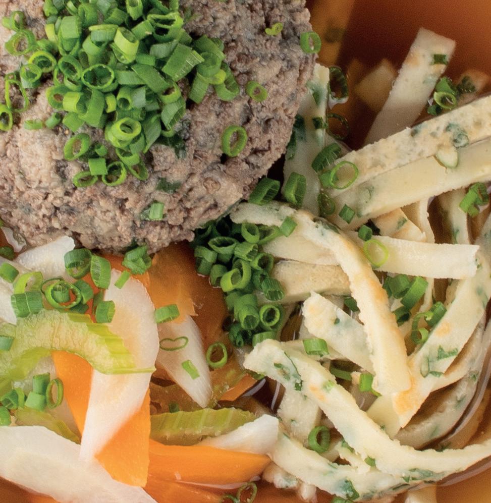 Hovězí vývar s játrovým knedlíčkem, bylinkovou palačinkou a zeleninou