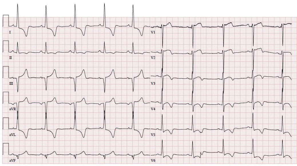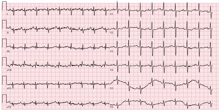 obr. 3.10 Pozitivní modifikovaná Cornellova kritéria u pacienta s HKMP; vysoká amplituda R v I, aVL, V5, V6; term. negat. T ve V1, V2, hluboce invertované T v I, aVL