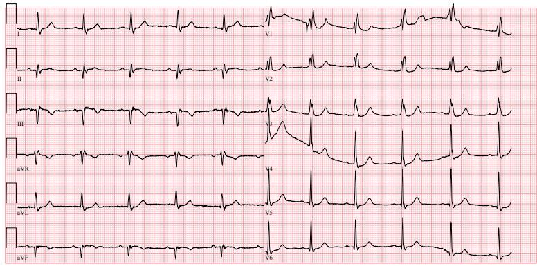 • inverze vlny T – vždy patologická ve svodech I, II, V3–V6 – nejčastěji vzniká při ischemii, ale inverze T je nespecifickým znakem