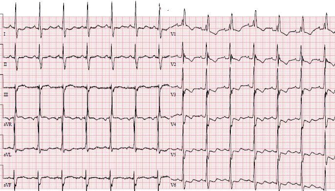 obr. 3.15 Sinusový rytmus s vlnou delta; sinusový rytmus s frekvencí 57/min; krátký interval PQ (90 ms); přítomnost vln delta; široké komplexy QRS (150 ms); abnormality segmentu ST a vlny T – ve svodech II, III a aVF – descendentní deprese ST a inverze vln T ve svodu s pozitivní vlnou delta