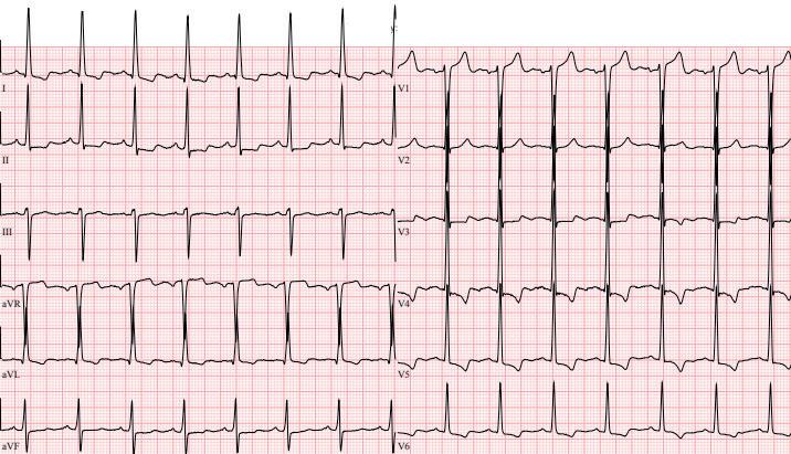 ~ BPTR: QRS > 120 ms, rSR‘ ve svodech V1 a V2, hluboký a široký kmit S v laterálních svodech (I, aVL, V5, V6)