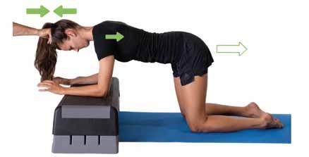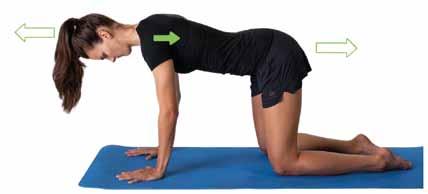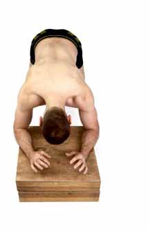 ZAUJMUTÍ CVIČEBNÍ POLOHY: Poloha se podobá vzporu na předloktí, rozdíl je v opoře rukou (viz foto na s. 7 7). Základem nastavení je opět přirozená torakolumbální lordóza. Hlava „nepadá“, brada je v neutrálním postavení. Osa těla prochází centrem pánevního dna, středem šíje a zadní částí temena hlavy. Ramena nastavíme do frontální roviny (ne protrakce či retrakce) a následně maximálně rozšíříme. Lopatky se nepřibližují k sobě (k páteři).