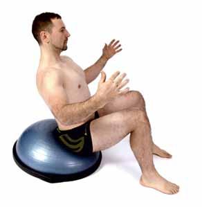 CVIČENÍ: Cvičení je obdobné aktivaci v lehu na zádech. Palce (prsty) položíme na nejširší místo boků a hluboko je zatlačíme do měkkého prostoru mezi dolním okrajem žeber a hřebenem kosti kyčelní. Následně zesílíme tlak chodidel do podložky tak, jako bychom chtěli vstát. Sedací hrboly přitom necháme opřené o opěrku. K „natlakování“ břicha by mělo dojít spontánně, iniciací k němu je přenos zátěže více na chodidla. Při zapojení BH cítíme vytlačení palců z prostoru boků současně s pocitem osového protažení trupu. Známkou správného provedení je uvolnění ramen, současně s pocitem