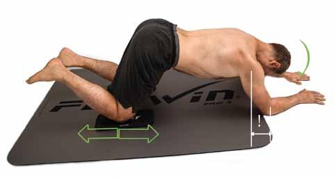 CVIČENÍ: Skloníme a uvolníme šíji. Střídavě popojíždíme koleny dopředu a dozadu, ramena stojí, jsou po celou dobu za lokty. Začínáme s malým rozsahem pohybu, s rostoucí kondicí můžeme pohyb prodloužit téměř do lehu. Pokud nemáme kluzné podložky, cvičíme bez pohybu kolen pouze ve smyslu izometrického střídání přítahu a odtlačení. Možnou variantou je přidat při tlačení rotaci nebo úklon v bedrech a s přítahem kolen návrat zpět. Pro toto provedení je potom třeba dát kolena k sobě.