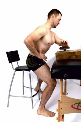 ZAUJMUTÍ CVIČEBNÍ POLOHY: Polohu budujeme od chodidel. Jejich vnitřní hrany nastavíme rovnoběžně, přibližně ve vzdálenosti boků. Kolena jsou mírně pokrčená a jejich průmět se kryje se špičkami chodidel. Sedacími hrboly se opřeme o stoličku. Zčásti stojíme a zčásti sedíme. Trup v kyčlích mírně nachýlíme dopředu. Vyvarujeme se přitom kyfotizace beder. Nutná je dlouhá lordóza, zasahující i dolní hrudní páteř. Ramena držíme ve frontální rovině, šíje je protažená a uvolněná. Hledáme osové protažení celého trupu současně s pocitem pevné opory v oblasti pánve a břicha. Výhodné je, společně se stoličkou se mírně naklonit dopředu.