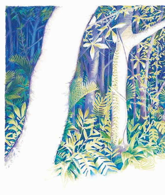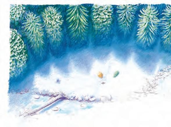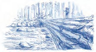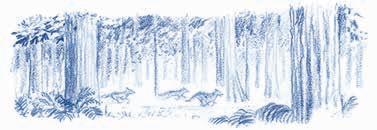 Les je ze všech míst k táboření nejkouzelnější. Na této kresbě je zachyceno naše tábořiště v kanadské divočině – vstoupili jsme do dosud neposkvrněného světa. Les nás chránil před živly.