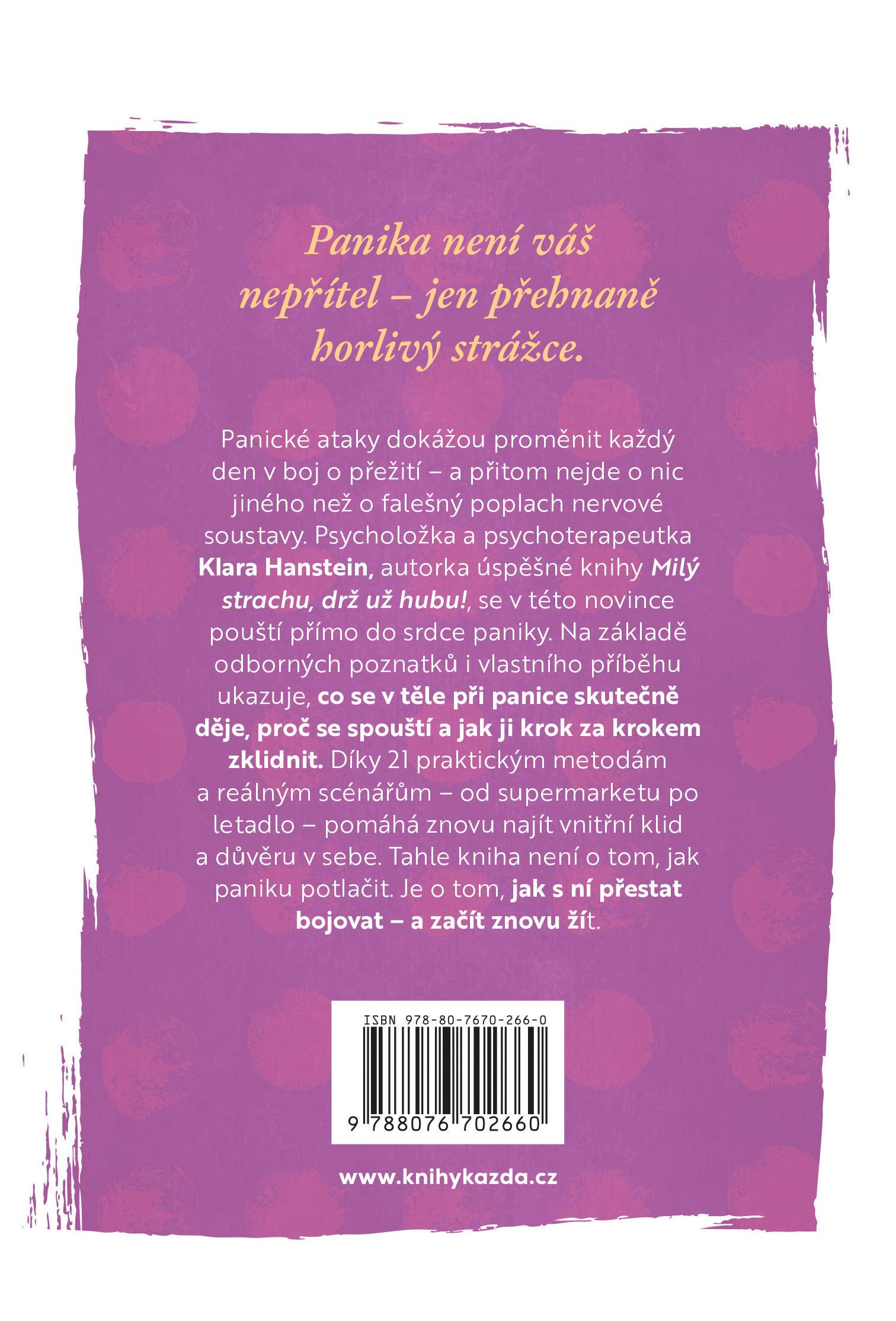 Jmenuji se Klara, jsem klinická psycholožka a psychoterapeutka a už mnoho let dobře vím, jaké to je, když úzkost a panika ovládnou celý život. Možná jste už četli moji první knihu Milý strachu, drž už hubu! a víte, že jsem sama dlouho žila s úzkostnou poruchou a panickými atakami.