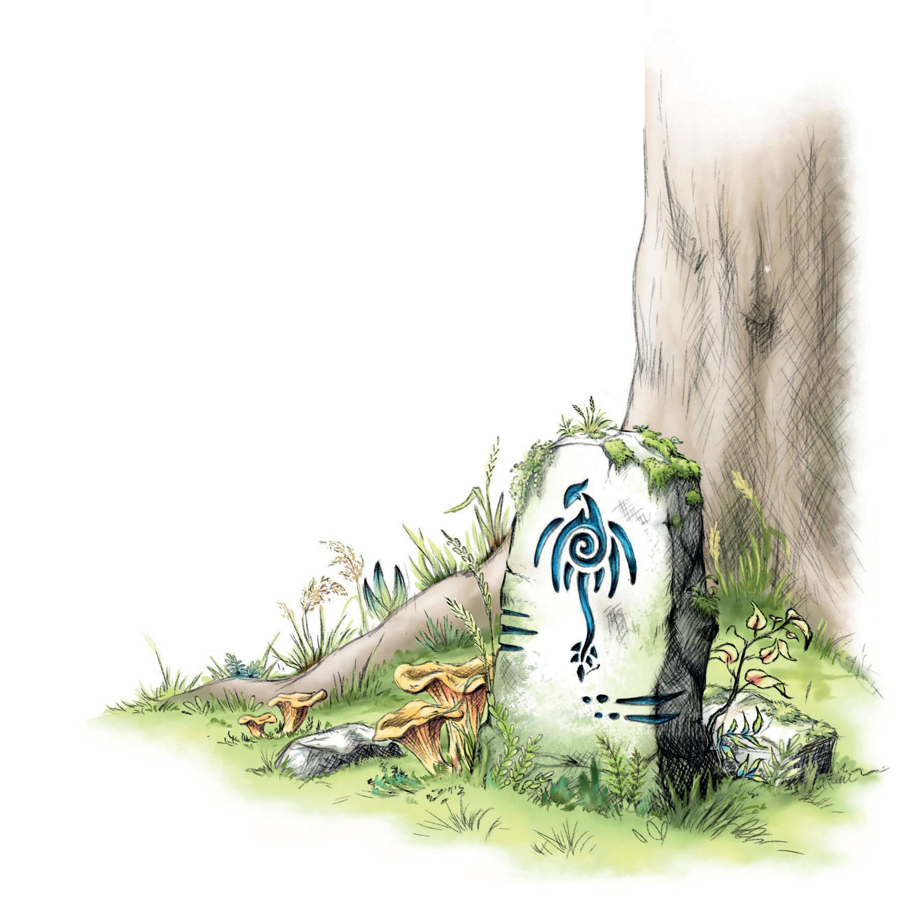 Pokračovaly jsme pěšky k nedalekému lesíku, kousek od něj se mamka zastavila u kamene s podivným symbolem – runou.