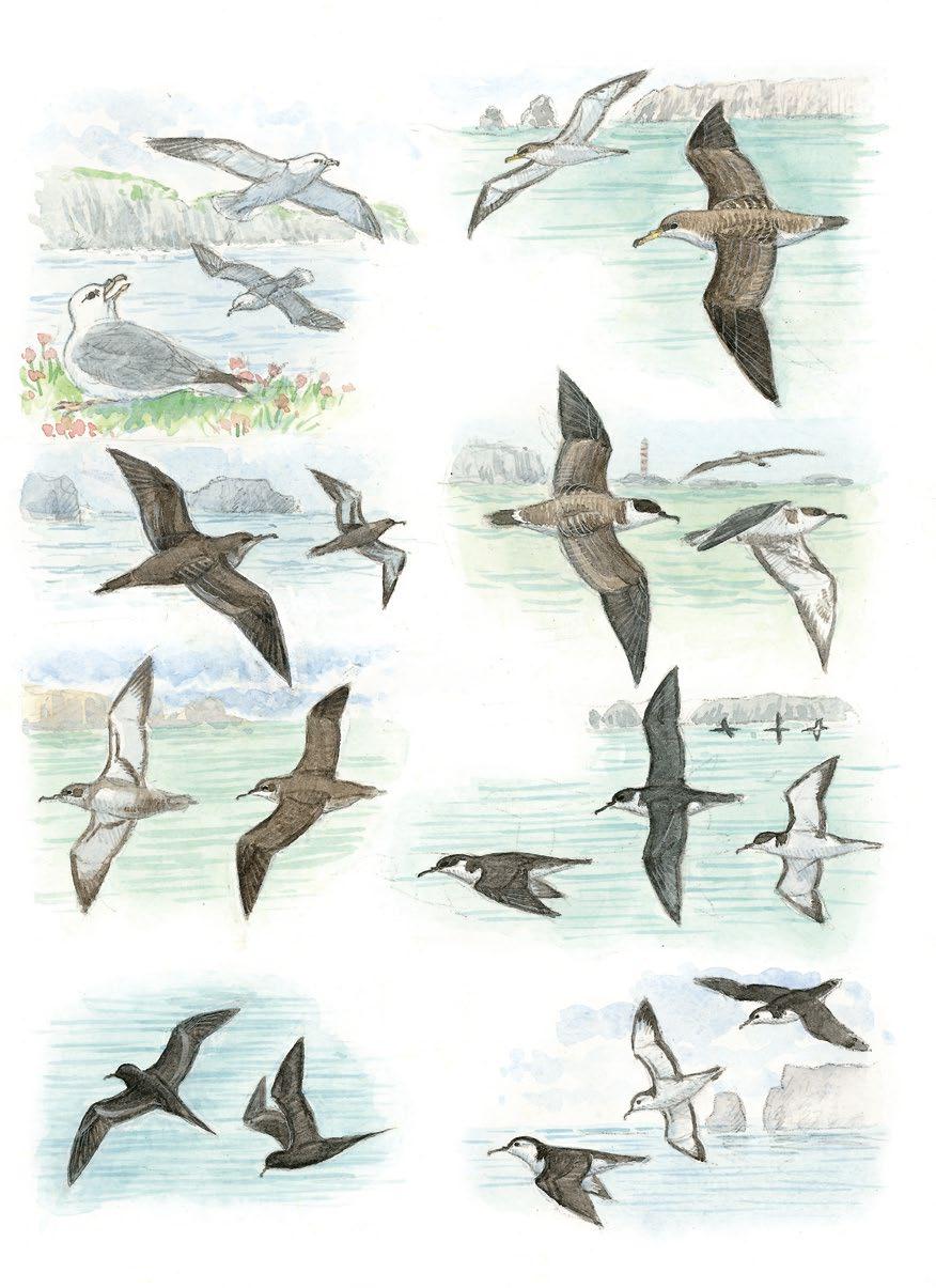 B. severní (dole) – největší buřňáček, dlouhá křídla, velmi zahnutá vzad, špičatá. Dlouhý vidlicovitý ocas.