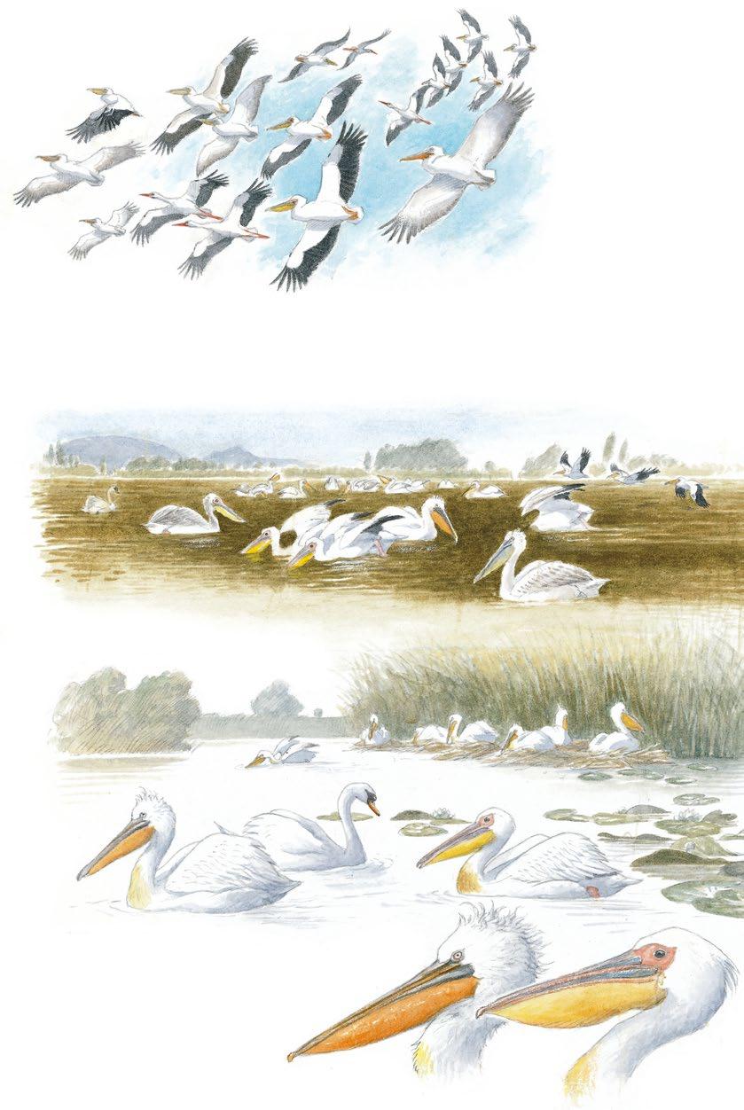 Pelikán bílý – často velké kolonie, hodně času tráví společným rybolovem. Kolonie v deltách řek, na ostrovech velkých jezer apod., v nížinách. V téže kolonii mohou být dva druhy.