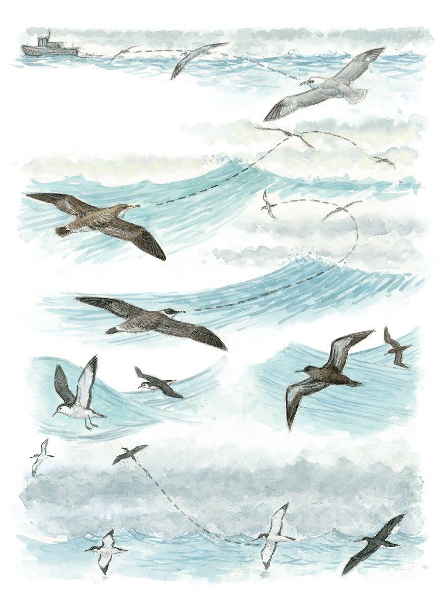 B. lední – na rozbouřeném moři nestřídá mávání s plachtěním a pouze plachtí. Bezstarostně, s lehkostí létí kolem hřbetů vln.