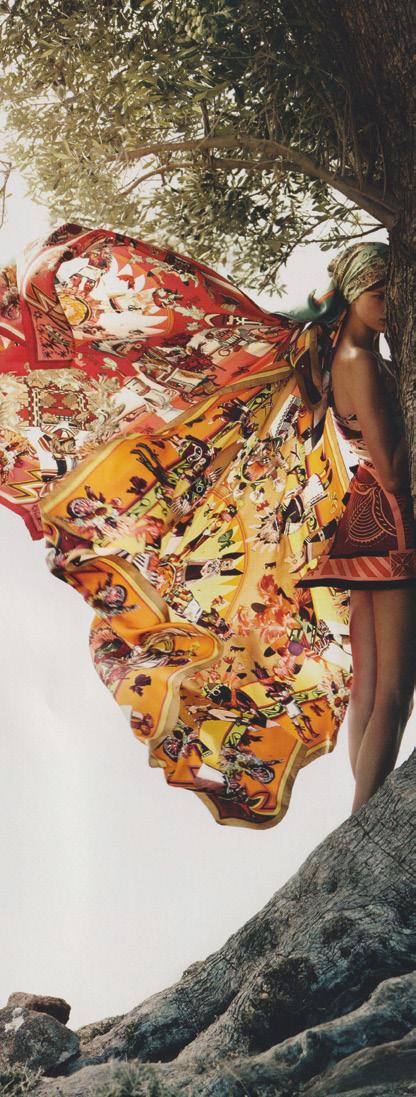 Na protější straně: Reklamní kampaň Hermès pro sezónu jaro/léto 2012, The Gift of Time (Dar času), na fotografii modelka Bette Franke s šátky v designu Kachinas, jež jsou dílem Kermita Olivera.