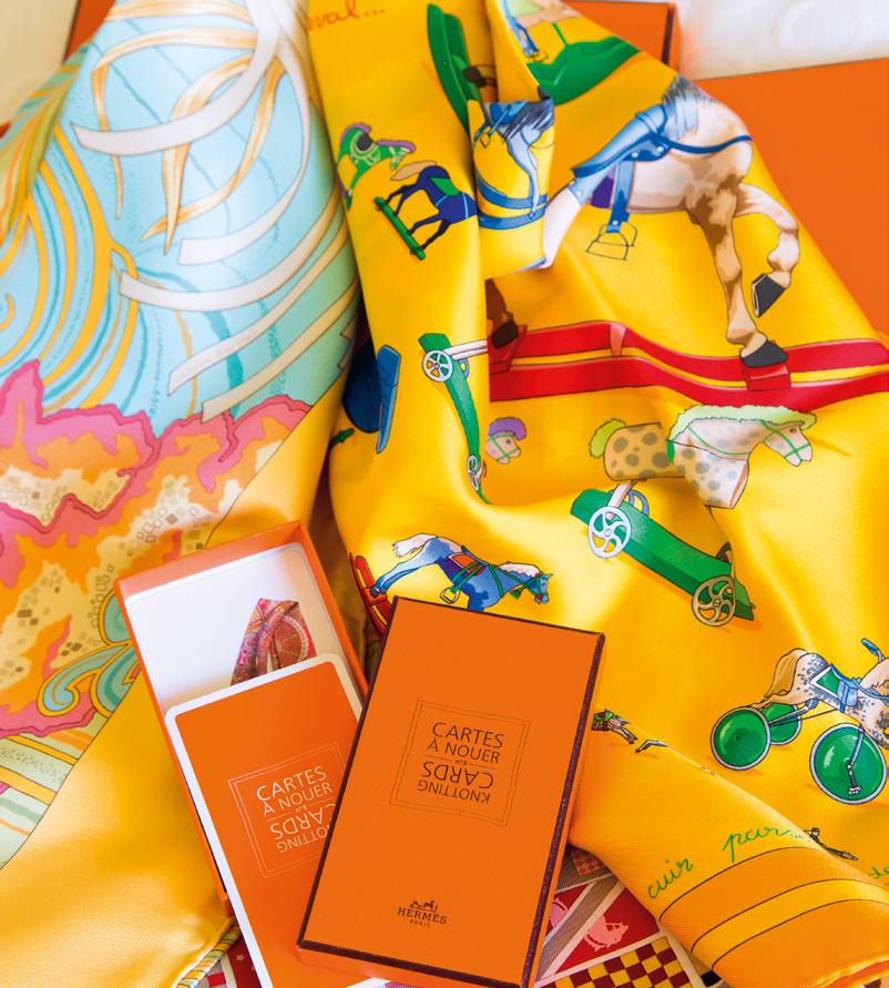 Na protější straně: Šátek Hermès Raconte-Moi le Cheval s potiskem houpacího koně z roku 2004 spolu s kartami s obrázkovým návodem, jak se dá šátek nosit.