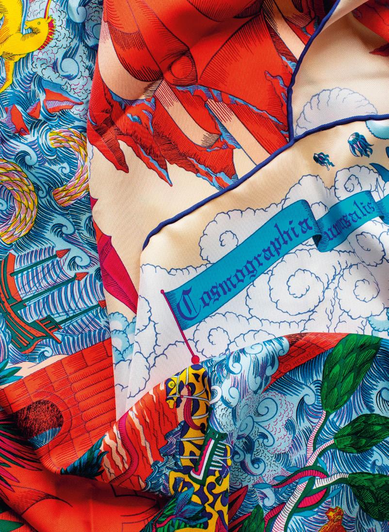 Na protější straně: Detail šátku Cosmographia Universalis od Jana Bajtlika z roku 2019. Design byl inspirován knihou mýtů a legend od Sebastiana Münstera, která vyšla v Německu v roce 1544.