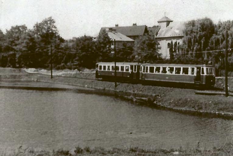 ↑ Projíždějící lokálka z Ostravy do Karviné pod kostelem, který již má sníženou věž. Foto: Sbírka po Jindřichu Wernerovi
