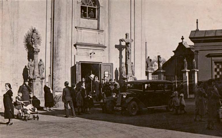 ↑ Čilý ruch před vstupem do kostela v období první republiky. Foto: Sbírka po Jindřichu Wernerovi