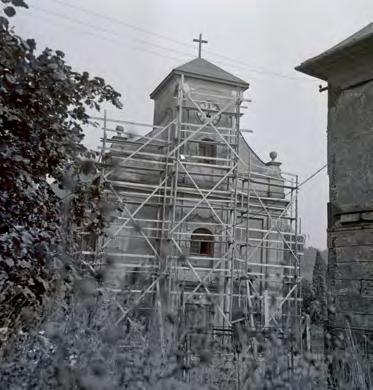 ↑ Rekonstrukce kostela v roce 1961, napravo roh bílé školy. Foto: Z fondů Národního památkového ústavu