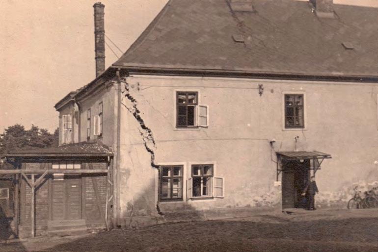 ↑ Poškozená farní budova během druhé světové války. Foto: Sbírka Jana Vrtala