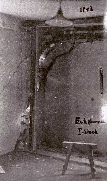 ↑ Rohová místnost se širokými trhlinami. Foto: Sbírka Římskokatolické farnosti Karviná-Doly