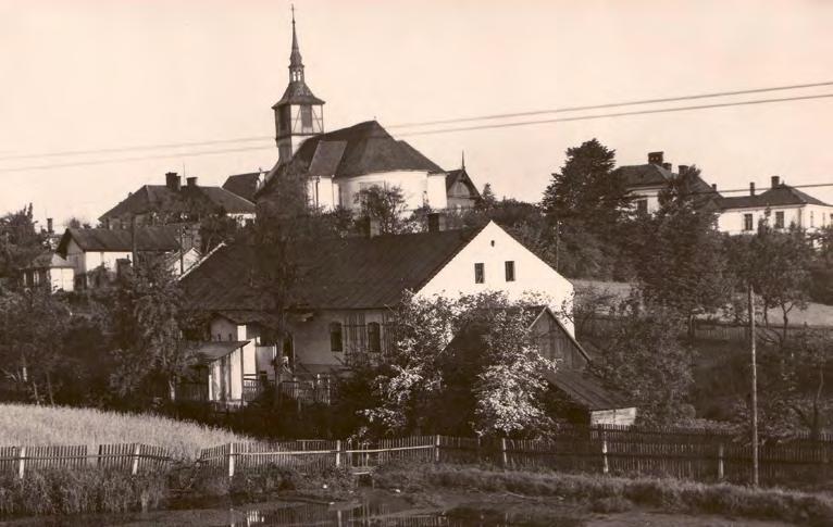 ↑ 30. léta minulého století, v popředí dům Richarda Sobalika, nad ním se tyčí starý kostel, vpravo farní budova. Foto: Sbírka Zdenka Janulka