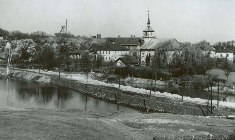 ↑ Fotografie z poloviny 50. let, kostel již nestojí na kopci a okolí je zaplavováno spodní vodou, tramvajová trať musela být neustále navyšována. Na obzoru těžní věž dolu Františka. Foto: Státní okresní archiv Karviná