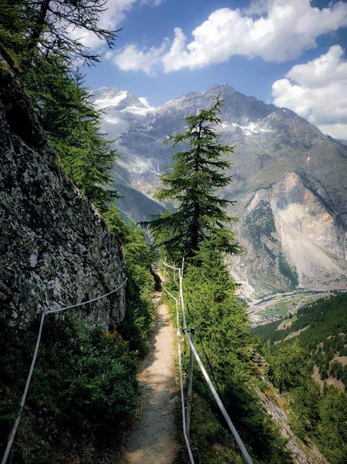 a klesání musím v jednotlivé dny absolvovat. Dříve by mě vysoká čísla děsila, teď už cítím úlevu, když v itineráři vidím méně než tisíc metrů stoupání za den. To znamená lehkou etapu. Vyběhnu serpentiny do sedla a přede mnou se otevře rozlehlé, ostře ohraničené údolí s blankytně modrým jezerem Lac des Dix, na jehož levém konci je mohutná přehrada. Roztomilými cestičkami sestupuju do údolí a kochám se nádhernými výhledy. Potkávám první turisty, jezero se zdá být populární mezi denními hikery. Nemůžu ale zůstat, není to můj dnešní cíl. Tím je vesnička Arolla za dalším horským sedlem.