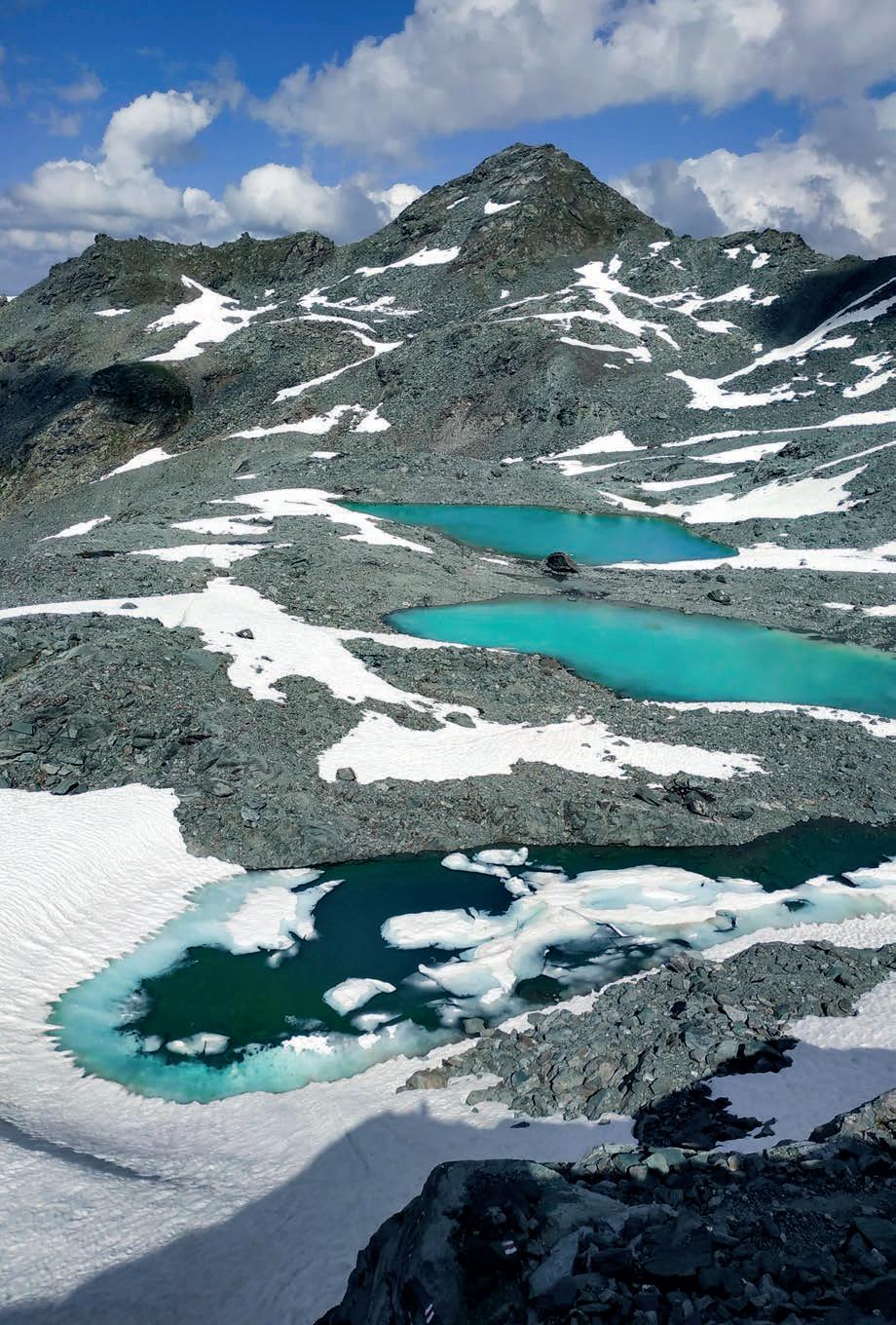 sněhovými poli, která zaberou většinu dne. S mačkami nebo lehkými nesmeky rozhodně nešlápnete vedle, pokud plánujete přejít trasu začátkem léta. Já je neměl a na jistotě mi to nepřidalo. Samozřejmostí jsou pak trekové hůlky, které pomůžou nejen v pohybu na sněhu.