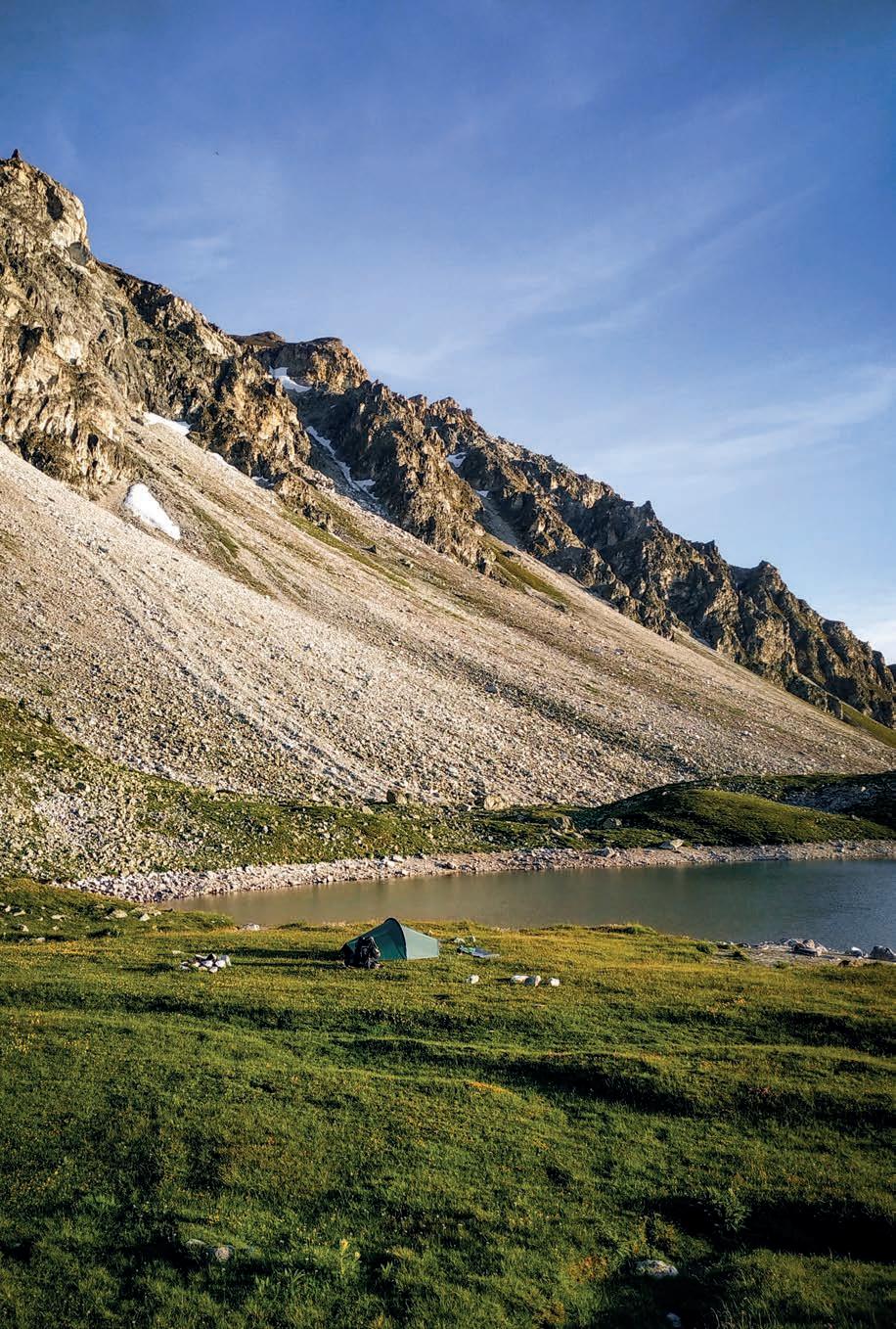 A teď jsem tu, na jednom z nejvíce dechberoucích míst, jaká jsem kdy viděl. Veškeré plánování mě nepřipravilo na tu krásu, která mě poslední týden obklopuje. Z rozjímání mě vyruší stádo kozorožců, kteří proběhnou kousek pod horským sedlem. Je čas vyrazit, dokud je světlo. Do spaní mi ještě kus cesty zbývá. Záda mi mezitím uschla, a tak mi ani nevadí si opět nasadit těžký batoh. Naposledy se ohlédnu na mrazivou pláň a začnu pomalu