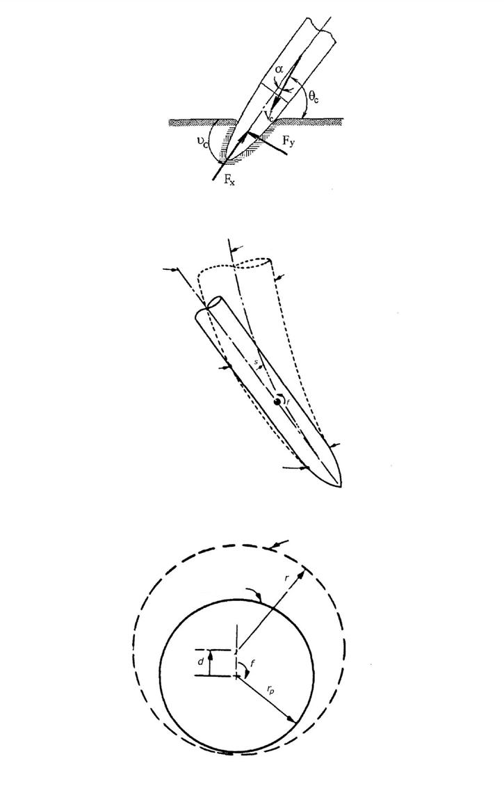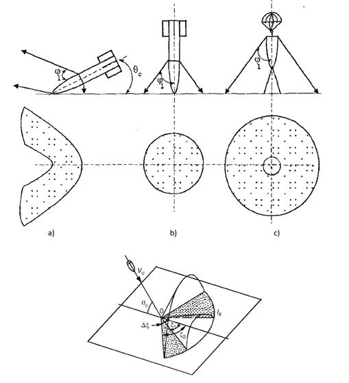 Obr. 1-11: Distribuce fragmentů bojové hlavice: a) dopad pod úhlem; b) vertikální dopad; c) vertikální dopad s aktivací distančním zapalovačem (nahoře a uprostřed). (Zdroj: A. P. Orlov, Osnovy ustrojstva i funkcirovania snarjadov RSZO); vytváření sektorů ničivého účinku na povrchu země (dole). (Zdroj: I. Balagansky, Damaging Effects of Weapons and Ammunition)