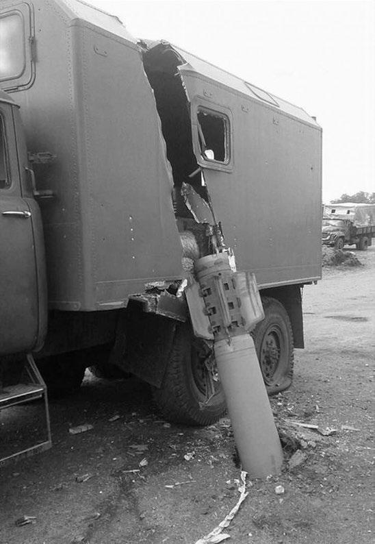 Obr. 1-7: Pohonná jednotka této ruské rakety BM-30 dopadla pod tak velkým úhlem, že roztrhla bok nákladního automobilu a polovinou své délky se zarazila do země. I ve válce je takovýto případ neobvyklý. (Zdroj: avia.pro)
