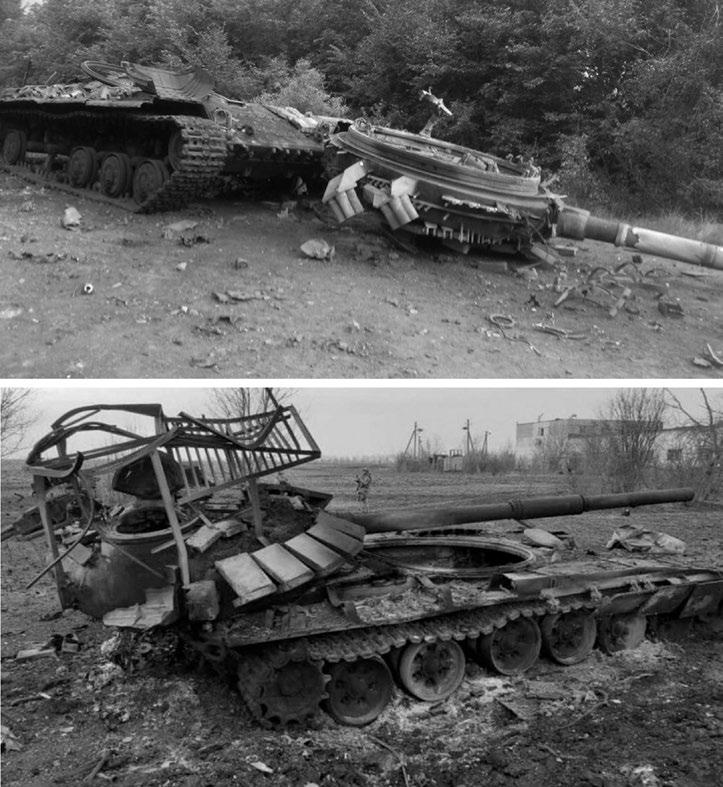 Obr. 1-19: Zničený ukrajinský tank T-64BV (nahoře) a ruský tank T-72B3 (dole). Odmrštěné věže v důsledku exploze uvnitř tanku. Automatické nabíjecí zařízení u většiny ruských a ukrajinských tanků má munici uloženou v karuselu pod podlahou (T-72, T-90), nebo na boku věže (T-80, T-84, T-64). Pokud PTŘS zasáhne tank shora nebo mezi věž a korbu, může dojít k probití pancíře (tloušťka pancíře stropu věže je 25–50 mm) a vyvolání výbuchu uložené munice, který dokáže věž odhodit. Média často uvádějí, že se jedná o ruské tanky, ale skutečností je, že obě strany přišly o velké množství techniky. (Zdroj: MO Ukrajiny a Ruska)