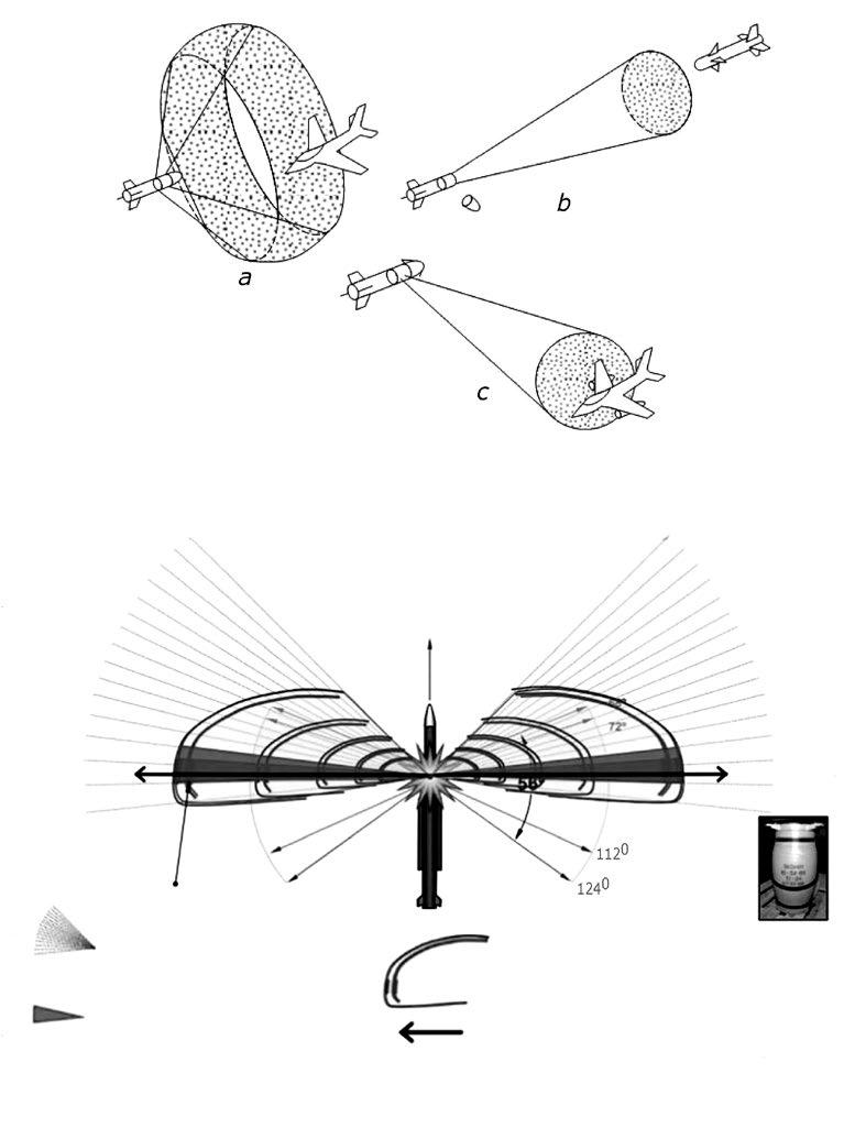 Obr. 1-13: Fragmentace: kruhová, axiální a radiální (nahoře). (Zdroj: V. V. Selivanov, Boepripasy, sv. 1); fragmentační obrazec střely 9M38M1 (systém Buk-M1), (dole). (Zdroj: Almaz-Antey)