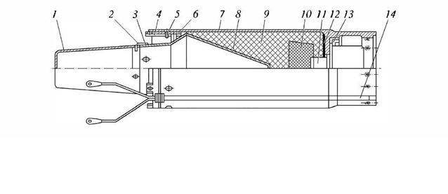 1 – horní kužel, 2 – izolační kroužek, 3 – spodní kužel, 4 – kroužek adaptéru, 5 – šroub, 6 – upínací kroužek, 7 – kovový plášť střely, 8 – vložka kumulativní nálože, 9 – výbušná náplň, 10 – vložka, 11 – bezpečnostní mechanismus, 12 – těsnění, 13 – upínací matice, 14 – vodicí drát