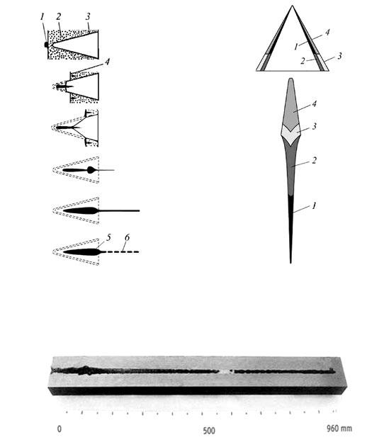 Vlevo: Obr. 1-15: Proces vytváření paprsku u kumulativní nálože (nahoře).
