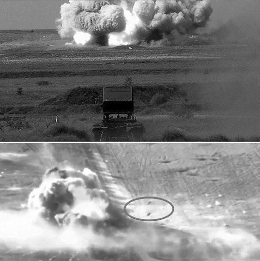 Obr. 1-20: Přímý zásah z těžkého raketometu TOS-1A (nahoře); záběry ruského dronu zobrazující zásah ukrajinského postavení termobarickými raketami. Voják (v kroužku) byl podle všeho odmrštěn na vzdálenost delší než 40 m (dole).