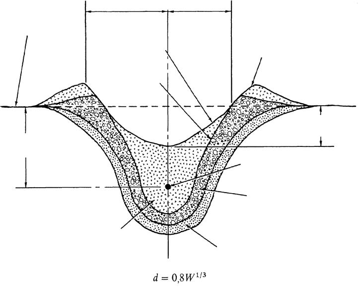 Působivým aspektem povrchové exploze je výsledný kráter (obr. 1-4). Velkou variabilitu vzniku kráteru naznačují směrodatné odchylky, jejichž průměrná hodnota se rovná přibližně jedné třetině průměru kráteru a které jsou uvedeny v rovnici na obr. 1-3.
