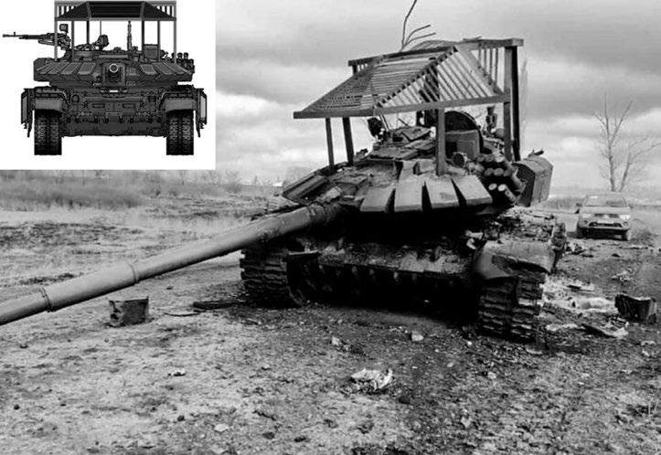 Obr. 1-18: Zničený ruský tank T-72B3 vybavený střešní klecovou ochranou (gur.gov.ua).