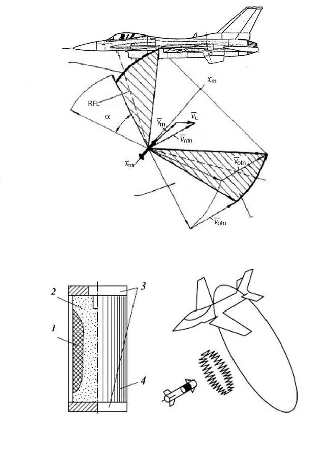 Obr. 1-12: Schematický nákres kinematiky výbuchu tříštivé bojové hlavice řízené střely země-vzduch (nahoře); působení tyčové bojové hlavice (dole). Tyče jsou vyrobené z oceli, mají kruhový nebo čtvercový průřez a kladou se na povrch výbušné náplně, obvykle pod určitým úhlem vzhledem k podélné ose střely. Tyče mohou být pevně připojeny (přivařeny) střídavě horním a dolním koncem. V tomto případě se po aktivaci tyče rozvinou do souvislého kruhu. Nejsou-li navzájem propojeny, vytvoří se pole obsahující velký počet dlouhých tyčových fragmentů. Tyče jsou od výbušné náplně odděleny tlumicí vložkou, aby během exploze náplně nedošlo k jejich zničení. Účinek takovýchto tyčových komponent na cíl se podobá účinku otvíráku na konzervy – souvislé zářezy do potahu letadla, jeho palivové soustavy, kostry a pohonné jednotky, které mají za následek jeho zničení téměř bezprostředně po zásahu.