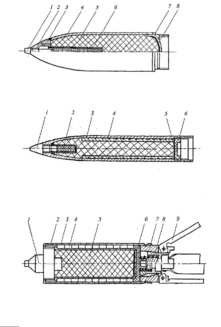 Konstrukční schéma trhavé (vysoce výbušné) bojové hlavice: 1 – zapalovač, 2 – objímka adaptéru, 3 – pouzdro těla, 4 – tělo, 5 – výbušná náplň, 6 – rozbuška, 7 – dno, 8 – tepelná izolace