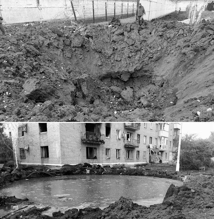 účinek výbušné munice optimalizované pro vytváření kráterů, které mají za cíl zablokovat přístupové cesty nebo narušit infrastrukturu.6 V městském prostředí představuje další nebezpečí odlupování. Jedná se o účinek rázové vlny, který se nejčastěji vyskytuje u materiálů křehčích než kov. Dochází k němu, když střela dopadne na vnější povrch pevného tělesa a způsobí odštěpení úlomků z jeho vnitřního povrchu. Střela nebo střepina přitom nemusí pevným tělesem proniknout; k odštěpení může vést i pouhý náraz s dostatečnou energií do vnějšího povrchu. Možným scénářem, který vede k tomuto jevu, je také zasažení cihlové zdi tlakovou vlnou nebo v některých případech projektilem nebo střepinou s dostatečnou energií, což způsobí sekundární fragmentaci uvnitř budovy. Významným nebezpečím specifickým pro městské prostředí je riziko fatálního narušení statiky budov způsobené tlakovou vlnou. Všechny osoby v těchto budovách a konstrukcích a v jejich okolí mohou být při jejich částečném nebo úplném zhroucení rozdrceny.7