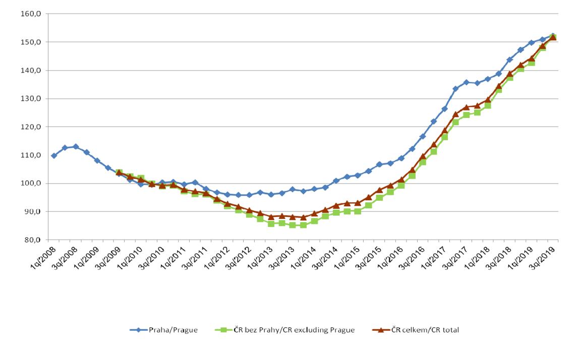 Indexy cen bytů v letech 2008-2019 (průměr 2010 = 100)