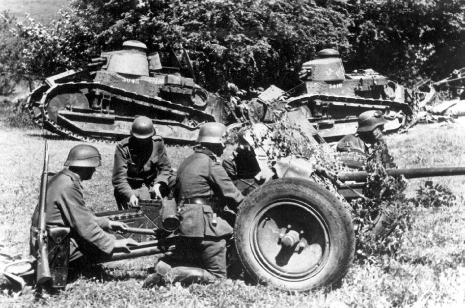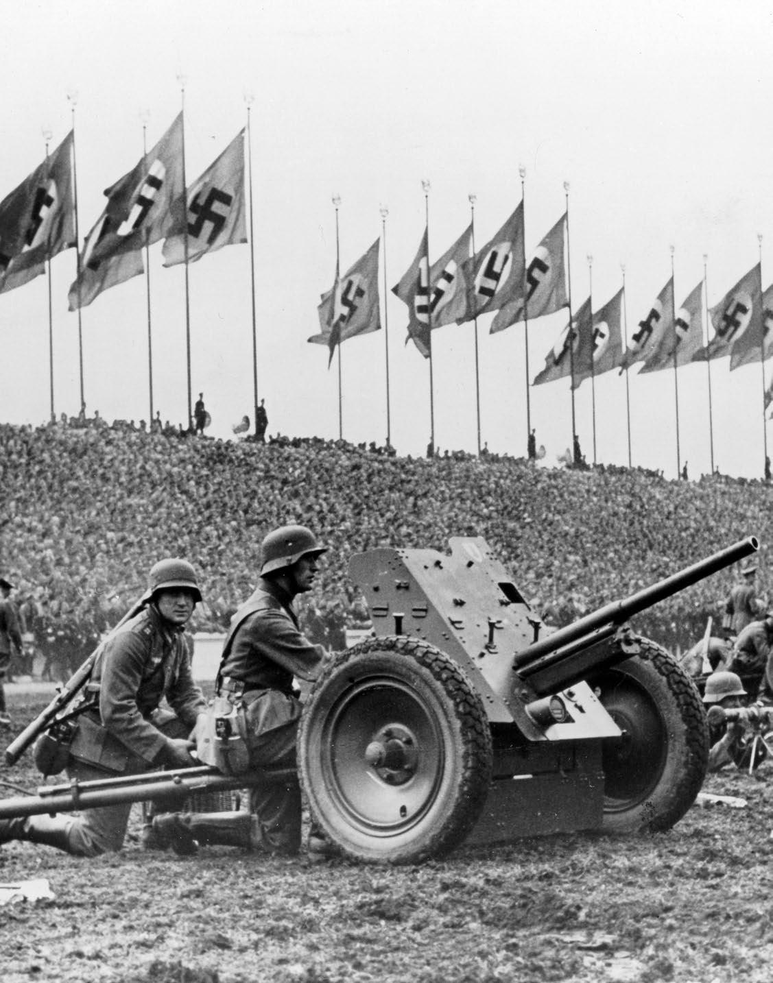 Na protější straně: Německé stíhače tanků byly zpočátku vybaveny Panzerabwehrkanone (PaK – protitankovým kanónem) ráže 3,7 cm. Na tomto snímku předvádí zbraň střelecký tým při propagandistickém shromáždění pořádaném Říšským stranickým sjezdem (Reichsparteitag) v Norimberku v roce 1936. (Getty)